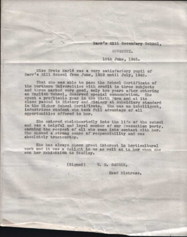 G.S: Yes, in fact, I arrived on 22nd of June and I went to school on the next day, the following day because my Aunt Margaret (as I called her) she was a history teacher at Barrs Hill Grammar School in Coventry. And so I went to school the following day of my arrival- after my arrival.